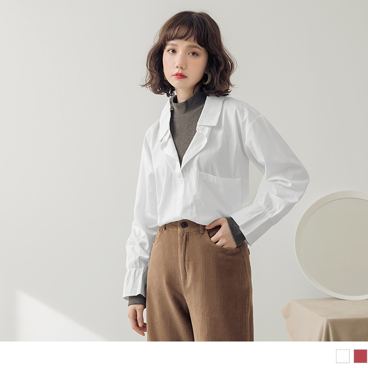 OB嚴選流行女裝OB嚴選假兩件式磨毛小高領喇叭袖開襟襯衫