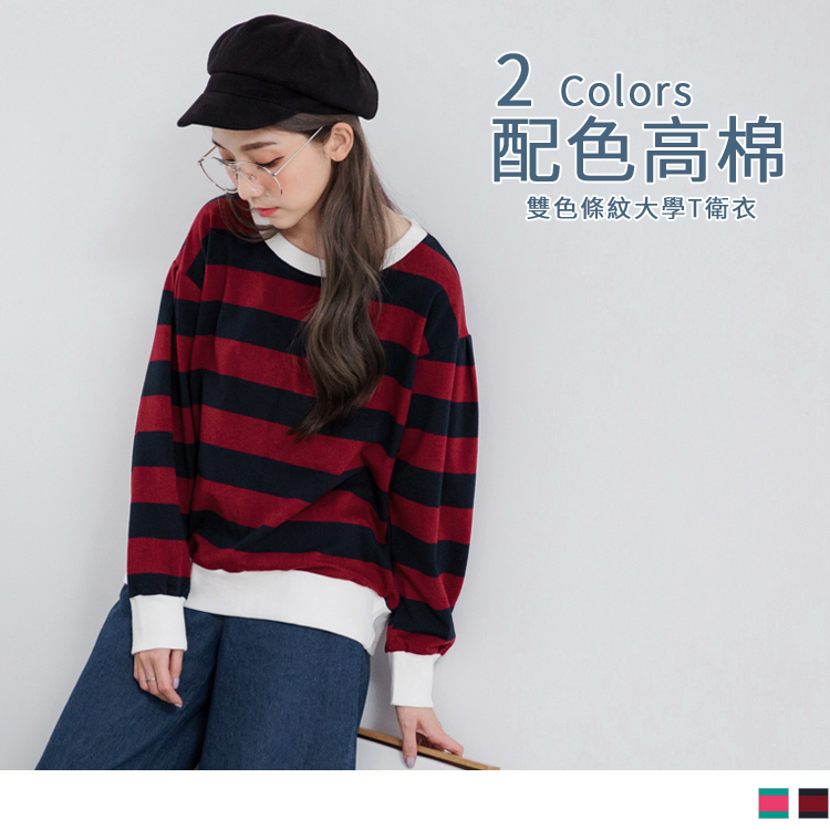 OB嚴選流行女裝OB嚴選高含棉撞色調橫條紋路大學T衛衣上衣