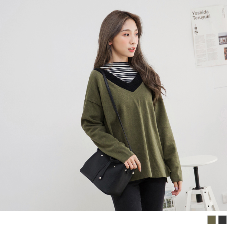 OB嚴選流行女裝OB嚴選暗色調絨毛面撞色羅紋V領上衣