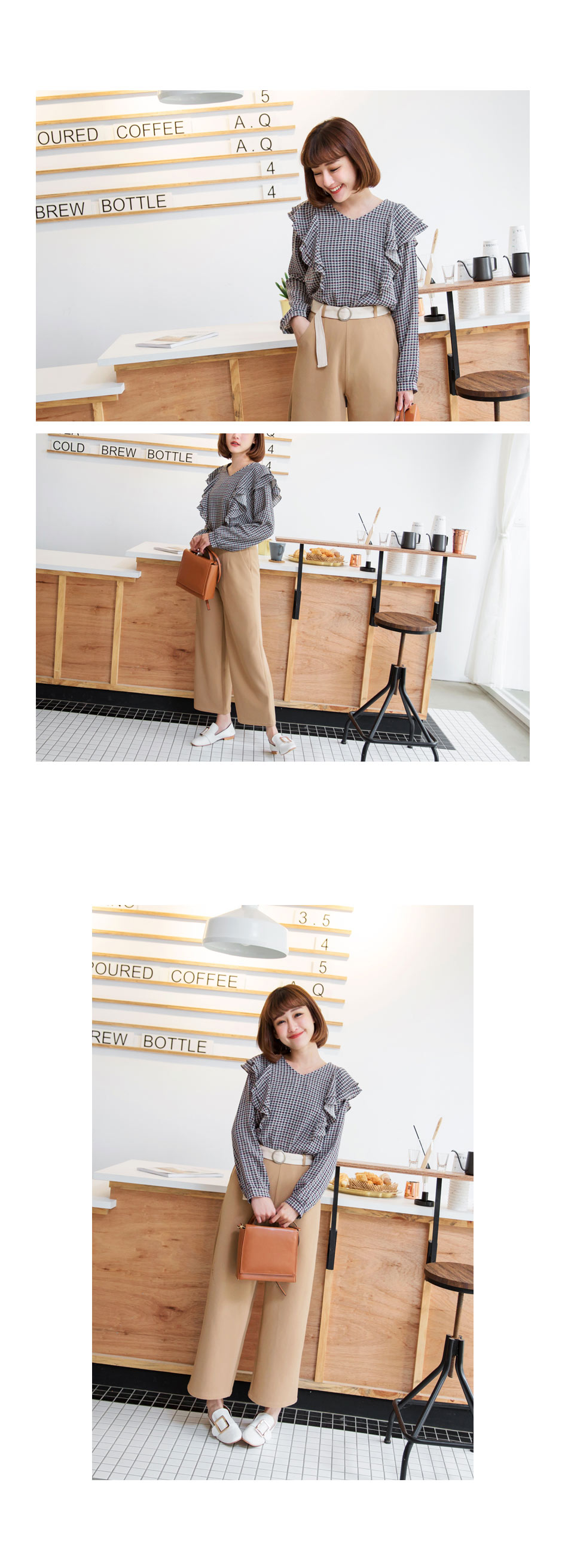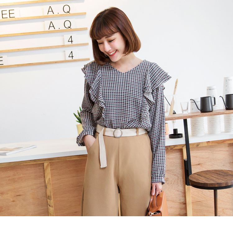 OB嚴選OB嚴選V領配色格紋拼袖荷葉袖雪紡上衣高CP值