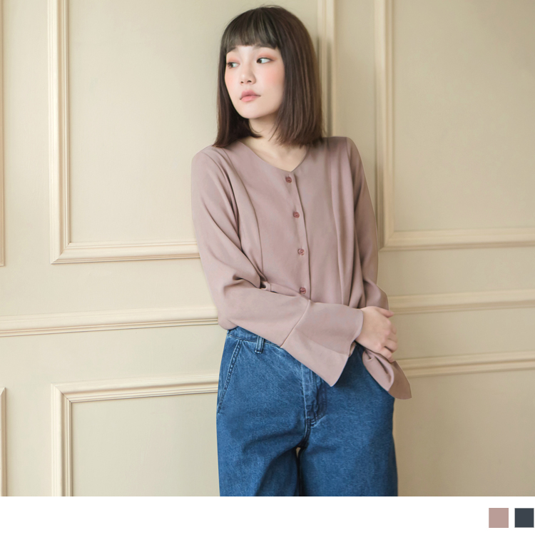 OB嚴選OB嚴選磨毛手感美背設計V領喇叭袖襯衫/上衣高CP值
