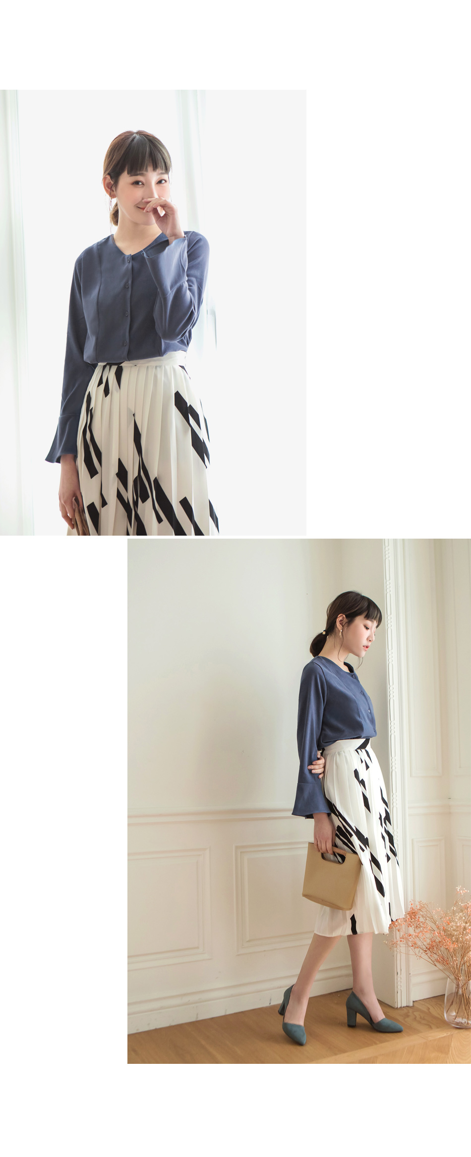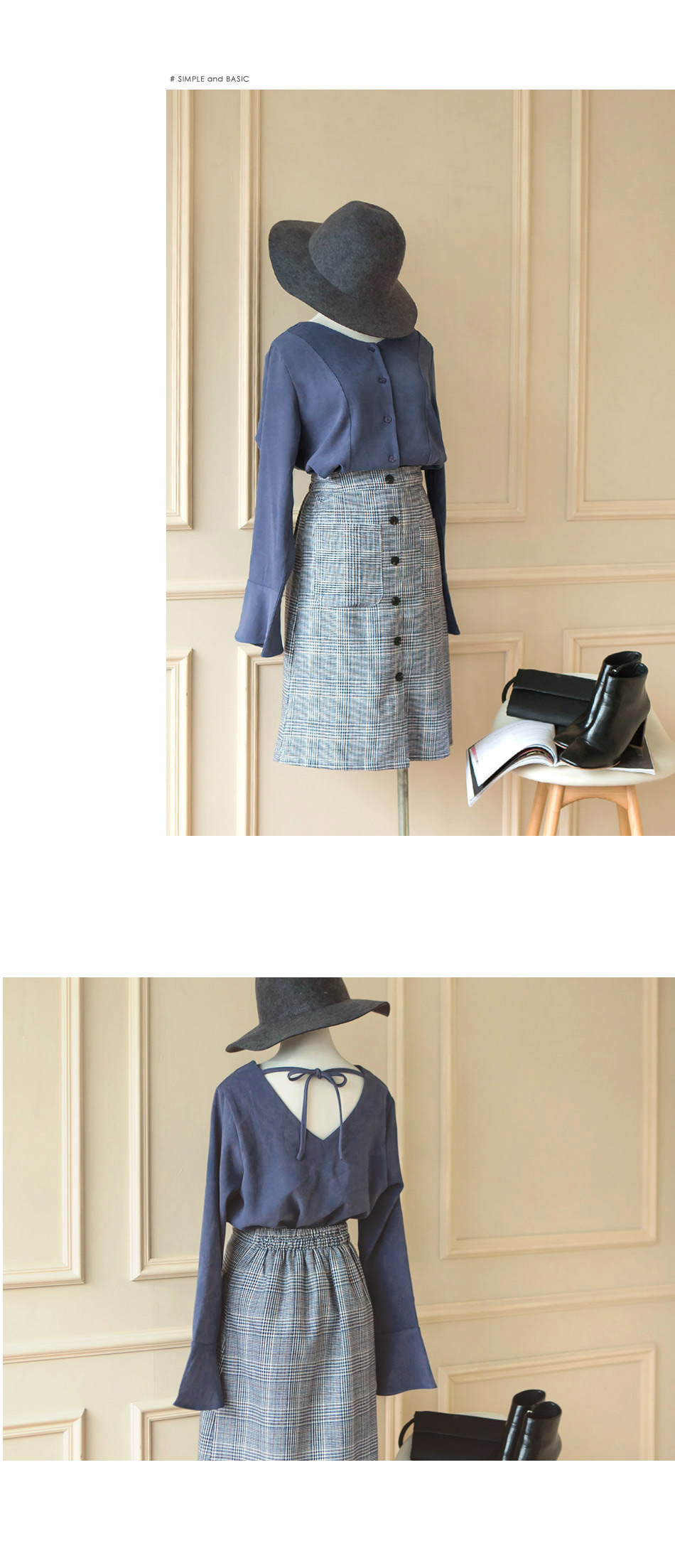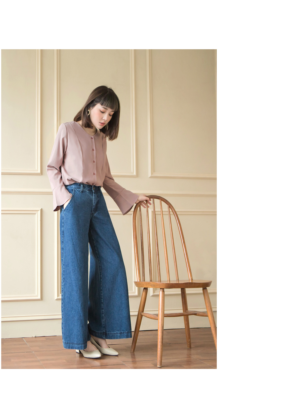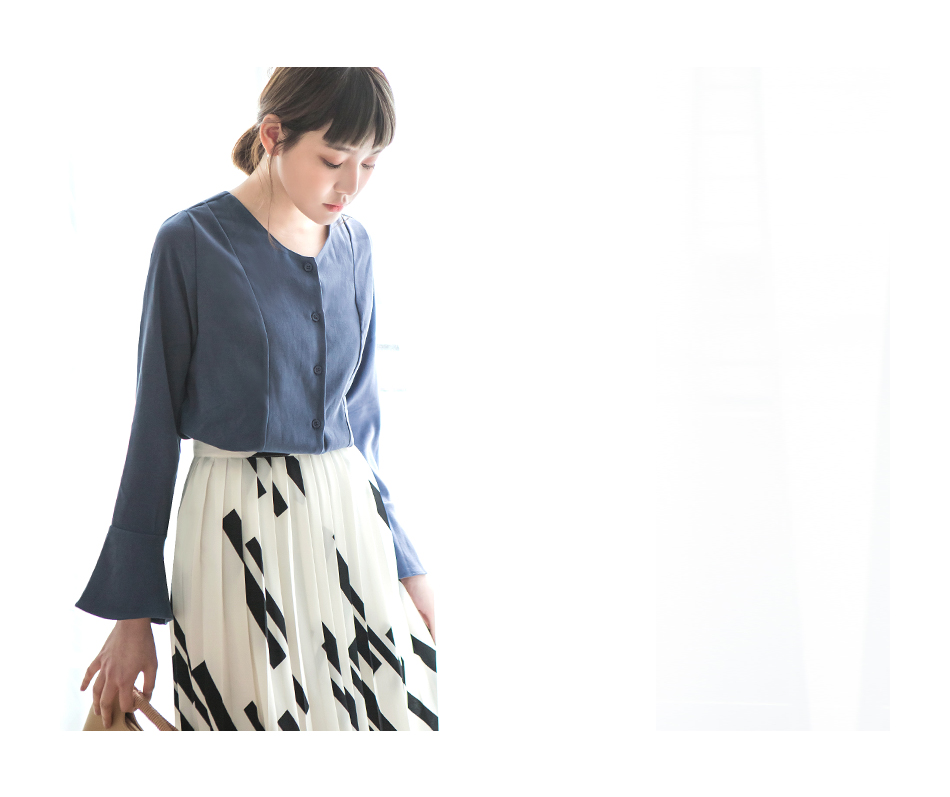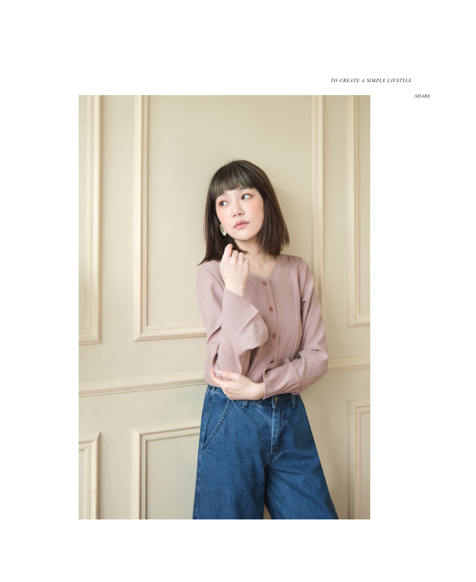 我不是很會穿搭衣服。我想找一件衣服OB嚴選磨毛手感美背設計V領喇叭袖襯衫/上衣